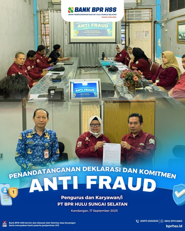 Pada tanggal 17 September 2025, seluruh jajaran pengurus dan karyawan/i Bank BPR HSS melaksanakan kegiatan Penandatanganan Deklarasi dan Komitmen Anti Fraud. Kegiatan ini menjadi wujud nyata keseriusan kami dalam menjaga integritas, meningkatkan kepercayaan masyarakat, serta memastikan bahwa seluruh layanan dan produk perbankan dikelola dengan penuh tanggung jawab.